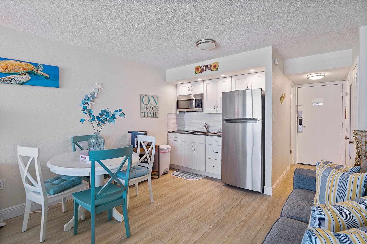 The Hawaiian Inn Resort is an ideal destination for a memorable getaway. Our stunning condo boasts a balcony with sunset and partial ocean views, beautifully decorated in a beach style. Stay connected with complimentary WiFi. If you need to whip up a quick snack or meal, our compact kitchen is fully equipped with all the essentials, including an apartment-sized refrigerator and freezer. Enjoy the comfort of our fully furnished space while preparing your favorite dishes. Daytona Beach, Florida, is a hub of activities and attractions for visitors. Key highlights include: 1. Daytona Beach: Ideal for sunbathing, swimming, and water sports. 2. Daytona International Speedway: Tour the iconic raceway and attend NASCAR events. 3. Ponce de Leon Inlet Lighthouse: Climb for panoramic views and learn about maritime history. 4. Beachfront Boardwalk and Pier: Explore shops, restaurants, and enjoy scenic walks. 5. Marine Science Center: Family-friendly exhibits showcasing local marine life. 6. Museum of Arts and Sciences: Features diverse exhibits and a planetarium. 7. Ormond Beach: A quieter retreat with beautiful parks. 8. Tomoka State Park: Perfect for hiking and kayaking. 9. Dining: Experience top spots like The Cellar, Chart House, Hull's Seafood, Caribbean Jack's, and Aunt Catfish's. Book now to experience all Daytona Beach has to offer! Feel free to message us to inquire about our early check-in and check-out options.