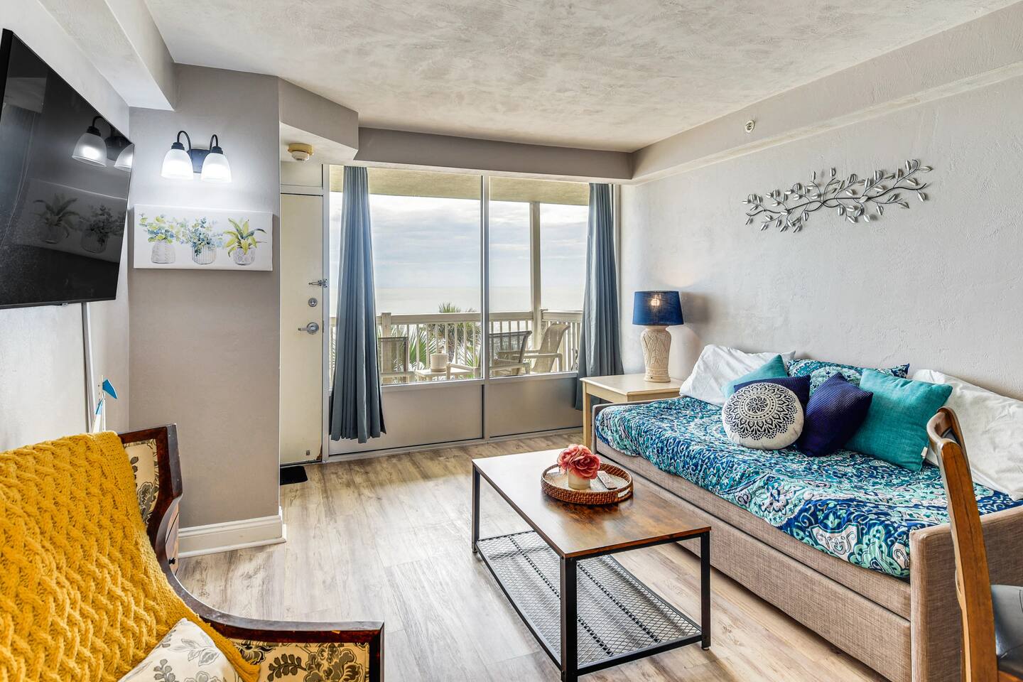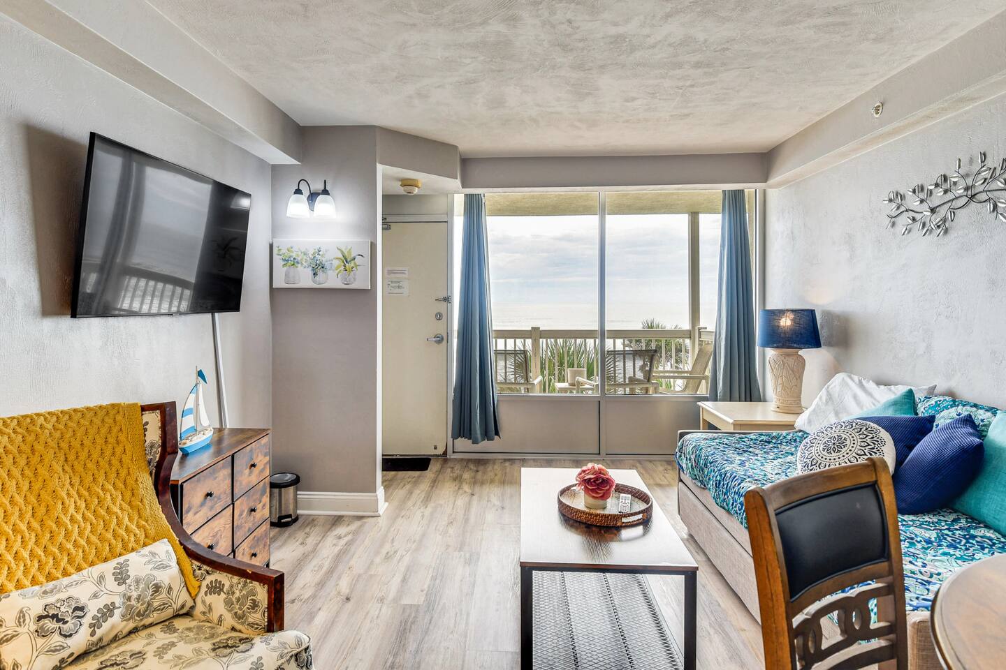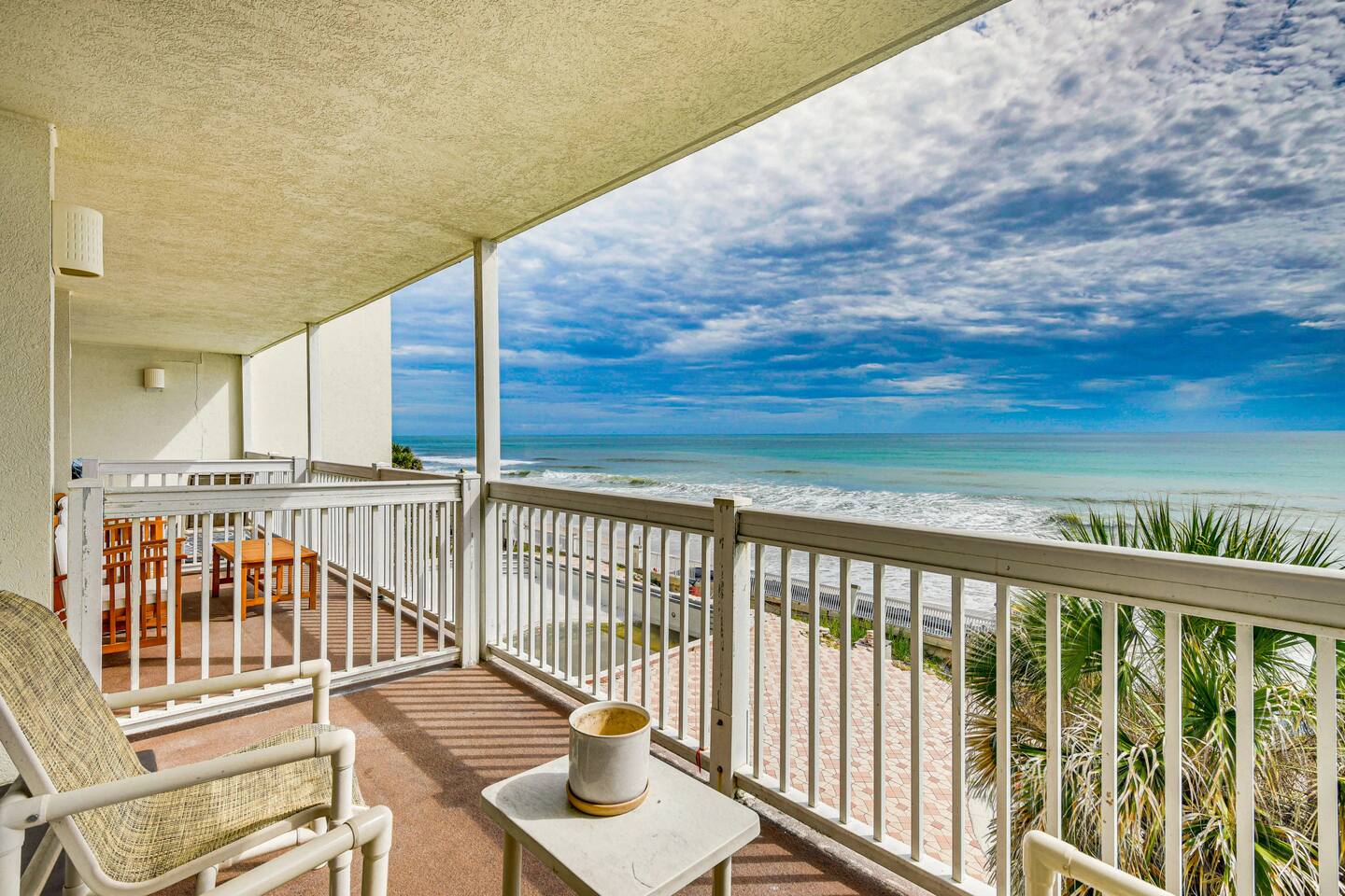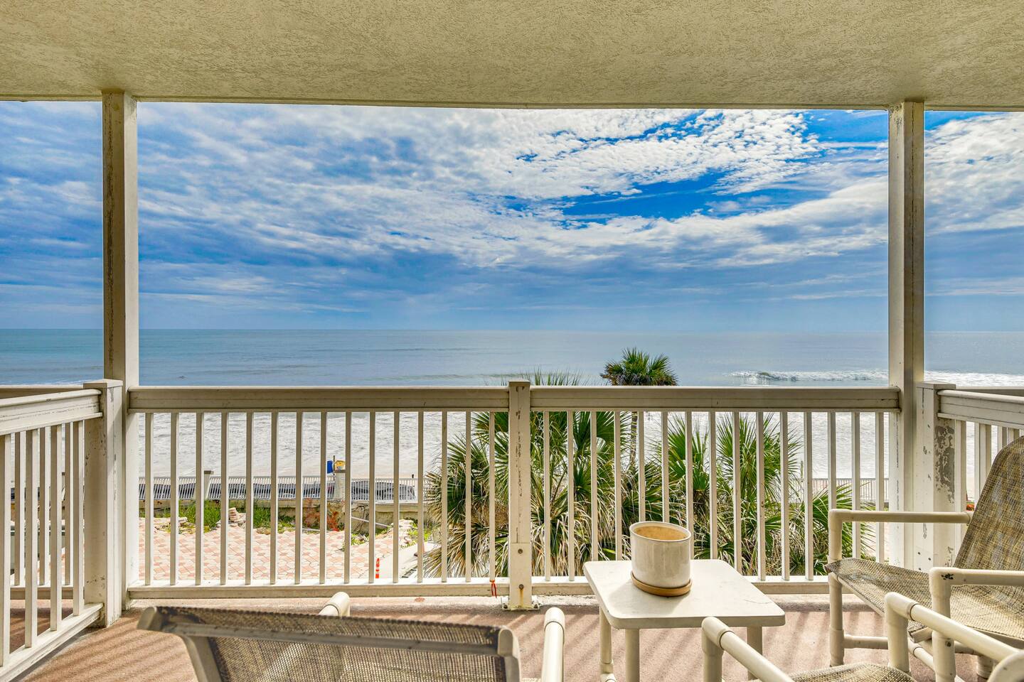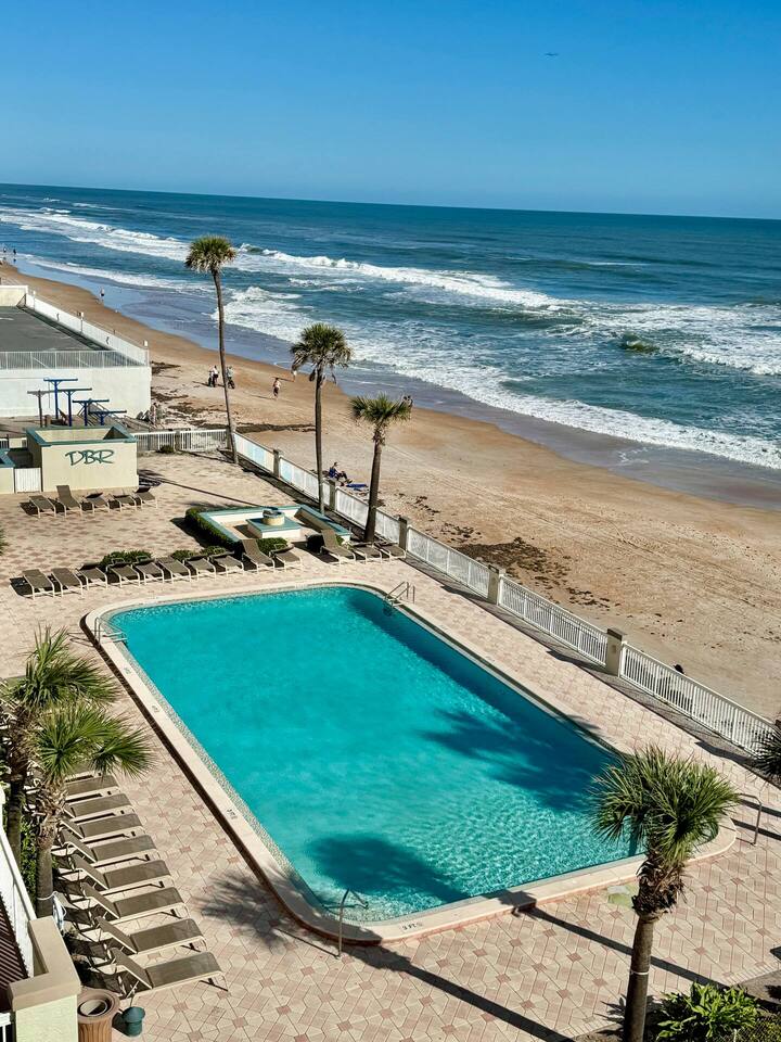 Wake up to breathtaking ocean views from the private, 3rd-floor balcony of our beautifully renovated 1-bedroom condo. This retreat is the perfect Florida getaway for families or groups of up to six guests. **Sleeping Arrangements:** * Two comfortable queen beds * A cozy daybed with two twin mattresses **Living & Entertainment:** * Relax in the living room with a 65" Smart TV * Enjoy a movie on the second Smart TV in the bedroom * Free high-speed Wi-Fi **Kitchen & Dining:** * A fully equipped kitchen to prepare meals, including: * Keurig coffee maker * Blender * Air fryer * Rice cooker **Comfort & Convenience:** * Central Air Conditioning * Keyless entry for easy, secure access * Beach essentials provided: chairs, towels, and umbrellas
