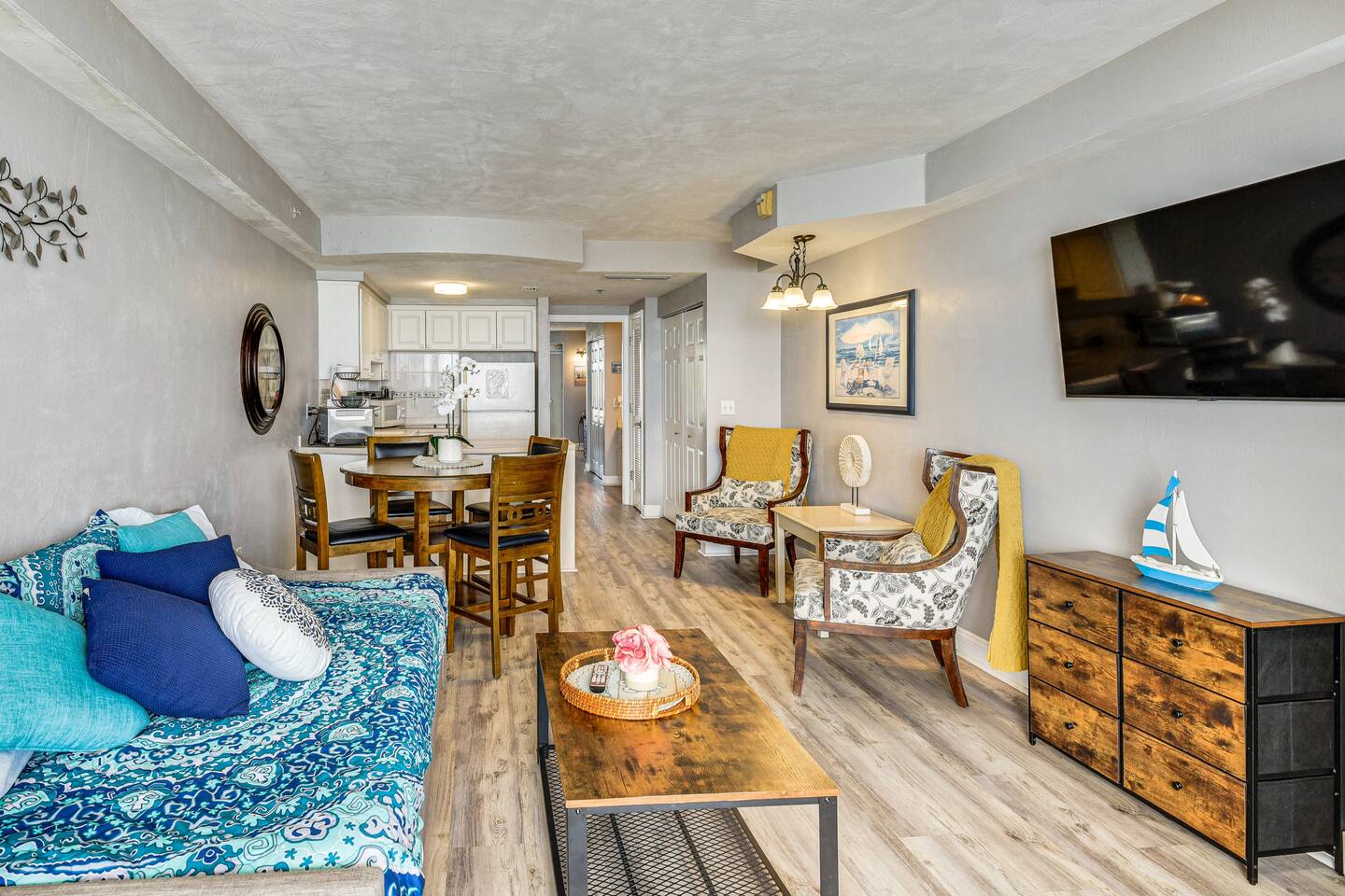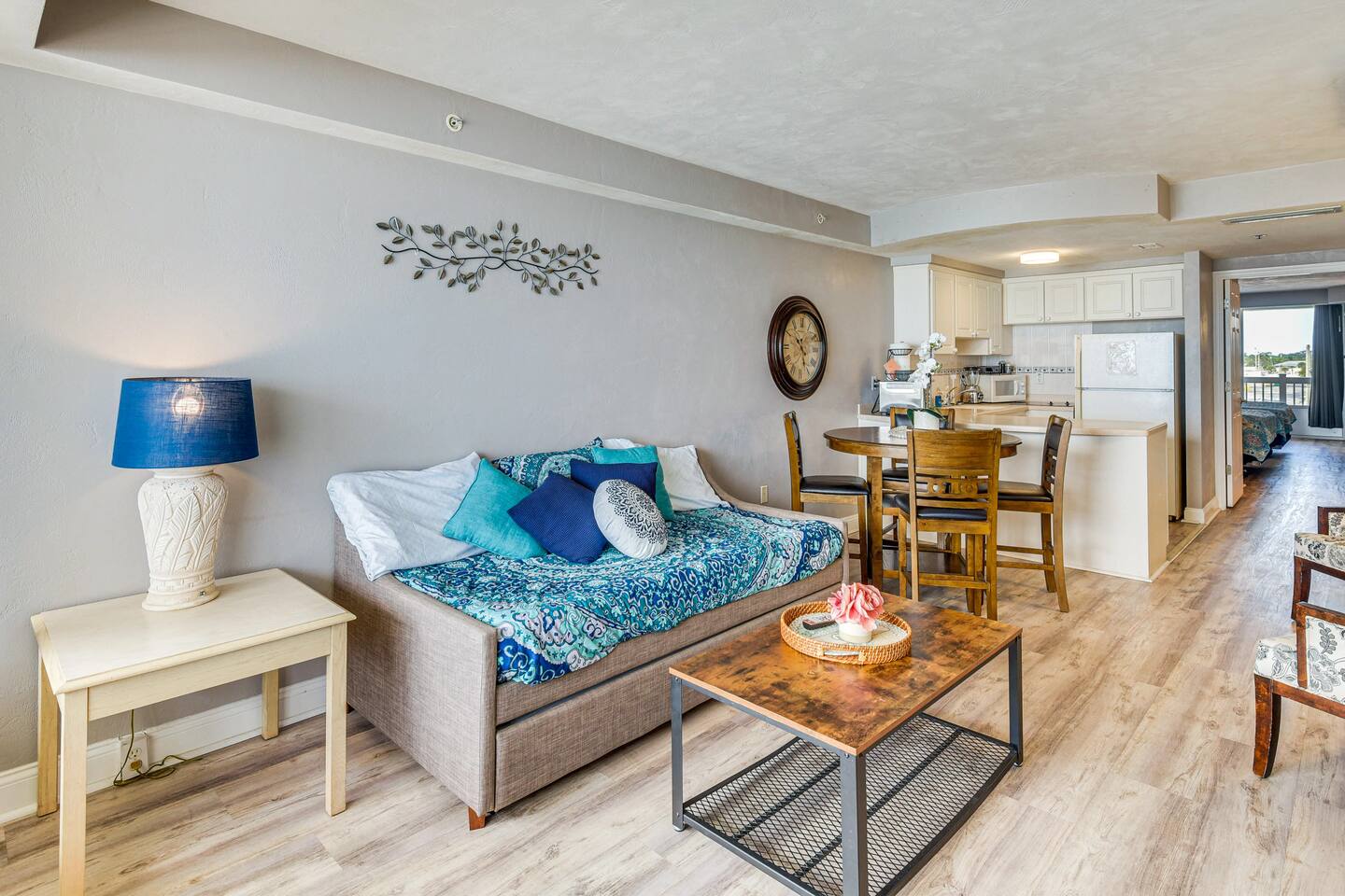Escape to our oceanfront Daytona Beach Resort condo! This 1-BR retreat sleeps 6 and features a private balcony with breathtaking ocean views. Enjoy a fully equipped kitchen, Smart TVs, and resort amenities including pools, a spa, and direct beach access. Perfect for a family getaway, this renovated space offers comfort and convenience with keyless entry and free Wi-Fi. Your ultimate Florida beach vacation awaits!