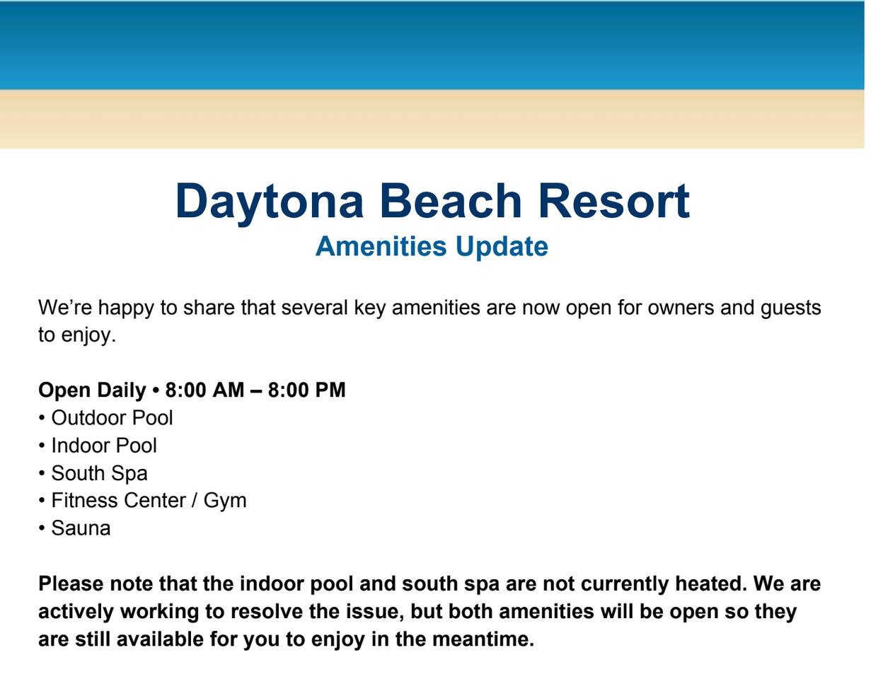 * **Ongoing Repairs:** Please be aware that the resort is undergoing ongoing repairs from damages sustained during the 2022 hurricanes. While we are thrilled to offer access to many amenities, the following remain closed: South side pool deck, Outdoor South Pool, Children's Pool, and the on-site restaurant and tiki bar. * **Beach Access:** Direct beach access is still available via a walkway just north of the building. * **Check-In:** Prior to 3:00 PM on your day of arrival, we will message you the combination for the electronic keypad on the door, along with detailed check-in instructions. * **Parking Pass:** The single parking pass provided must be returned and left inside the condo prior to your check-out. A replacement fee of $60 will be charged for any pass that is not returned.